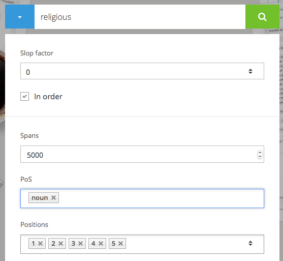 The first two options are used to define the 'seed query'. We want collocates of a single word, so we leave them as they are. Let's say 5000 sentences in which the word 'religious' occurs are enough for our purposes. The part of speech of the collocate is set to 'noun'. This is a shorthand notation for any common nouns. You may pick the option 'any' if you do not trust our tags. The positions of the collocate are set to either 1, 2, 3, 4 or 5. Negative position values can be used to specify collocates which should precede the node.