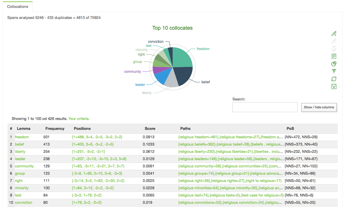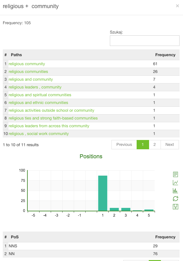 Let's say you want to extract a list of nouns frequently pre-modified by the adjective 'religious'. You could set the following collocation extraction options: